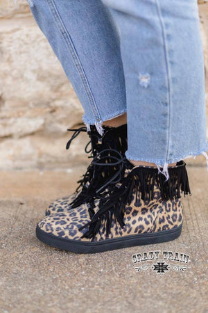 Introducing the exquisite New Boutique Crazy Train Sneaker, adorned with sleek black fringe. Crafted with a high top design to offer unparalleled ankle support and perfect for pairing with trendy cropped pants. Discover the ultimate fusion of fashion and function.