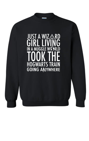 Get ready to feel magical in our Wizard Girl Screen Print Sweatshirt featuring the quote "Just a Wizard Girl Living in a Muggle World Took the Hogwarts Train Going Anywhere." This 8 oz. (US) and 13.3 oz. (CA) sweatshirt is made of 50/50 preshrunk cotton/polyester and Heather Sport colors are made with a 60/40 polyester/cotton blend for a softer feel and reduced pilling. The design is printed in white ink for a classic look, and the sweatshirt is crafted with double needle stitching at the shoulder, armhole, neck, waistband, and cuffs for durability. The 1 x 1 rib with spandex and quarter-turned fabric eliminate center creases for a comfortable fit. This sweatshirt is also equipped with a tearaway label for extra convenience. Care for your sweatshirt by hand washing with cold water, or machine washing on a low setting with the garment turned inside out. For best results