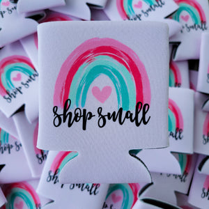 Boost your small business pride and show support for local shops with this can cooler! This must-have accessory is perfect for standard-sized cans and will add a touch of pizazz to your outfit at any gathering, party, or bonfire. Made with neoprene fabric and sturdy sewn seams, this collapsible cooler fits 12 oz cans and measures 4.3125" tall by 4" wide when laid flat. Keep your beverage chilled and frostbite-free with this trendy and playful item - just add your preferred brew! (Please note: beer not included).