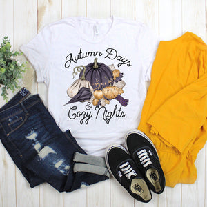 Autumn Days & Cozy Nights Tee: 4.2 oz.(US) 7 oz.(CA), 100% airlume combed and ringspun cotton, featuring unisex sizing and a coverstitched collar and sleeves. With shoulder-to-shoulder taping and side seams, this tee is designed for ultimate comfort and style. Embrace the season with our screen printed design and experience cozy nights in our staple tee.