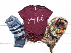 Express your gratitude with our "Grateful" quote screen printed in a crisp white ink on our 4.2 oz.(US) 7 oz.(CA) 100% airlume combed and ringspun cotton shirt. Perfect for all genders with its unisex sizing, this shirt features a coverstitched collar and sleeves, shoulder-to-shoulder taping, and side seams for a comfortable fit. And with a tear-away label, you won't have to worry about any annoying tags. Add a touch of positivity with the color white, chosen for its pure and inspiring qualities.