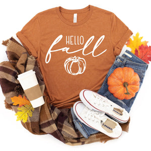 Experience the magic of Fall with our Hello Fall Screen Print T-Shirt! Care for your tee by washing inside out in cold water and tumble drying on low. Made with 100% airlume combed and ringspun cotton, it's built to last through many wears. Unisex sizing, a coverstitched collar and sleeves, shoulder-to-shoulder taping, side seams, and a tear-away label make this tee a durable and comfortable addition to your wardrobe. Ink Color: White.