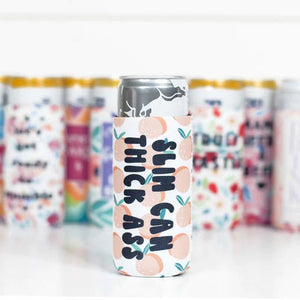 When your confidence is as strong as peach, let our Slim Can Thick Ass Can Cooler show it off! This neoprene cooler fits 12 oz slim cans or bottles, and boasts sewn seams and a slotted bottom. It's like a pro insulation for your drink, protecting your fingers from frostbite. And let's not forget - it looks stylish with any beer can! (Beer not included.)