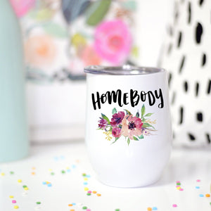 Be envied at all the parties with your sassy wine cup! Printed with the Word "Homebody" and a floral Design.
