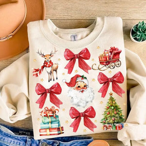 Get into the holiday spirit with this charming and whimsical traditional vintage design Christmas t-shirt. It features a jolly Santa, festive bows, a stack of presents under the Christmas tree, and a sleigh with his trusty reindeer. Don't miss out on this fun and festive sweatshirt.